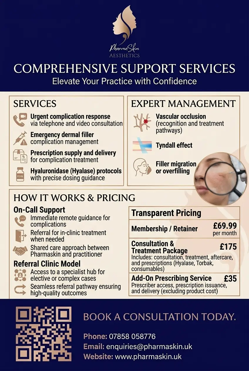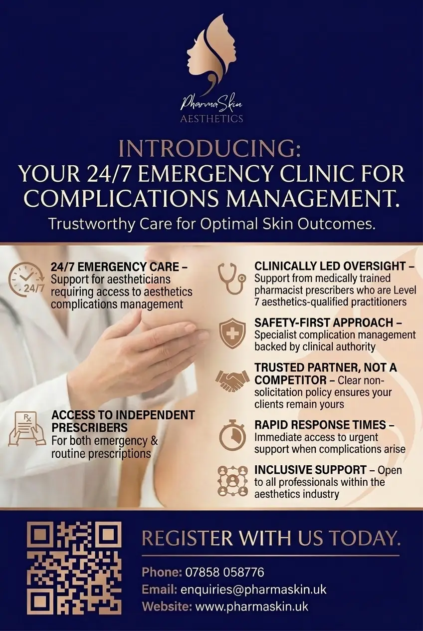 At Pharmaskin Aesthetics, your safety and well-being are our top priorities. While aesthetic treatments are generally safe when performed by qualified professionals, it is essential to understand how potential complications occur and are managed. As professionals we need to be educated to the risks and complications affecteing the face and blood supply in the area we are treating. Our Complications Management protocol ensures that every patient receives the highest standard of care, from prevention to resolution.